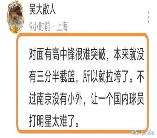 赛后,针对郭昊文此役糟糕的表现,网友们也是各说各话。有网友认为“这回怎么没有在喊进国家队了?”;“发挥太不稳定,打球一根筋,这表现真的不怪老叔不让他进国家队,数据好,是因为无限开火权刷出来了。”。也有网友认为“对面有高中锋很难突破,本来就没有三分半截篮,所以就拉垮了。不过南京没有小外,让一个国内球员打明星太难了。”;“这算是郭子这赛季第一次拉了…吸取教训好好调整吧”……