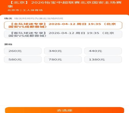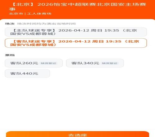 4月8日10:00,2026赛季中超联赛第5轮北京国安主场与成都蓉城的比赛,正式开票。按说这是御林军与领头羊之间的强强对话,球票应该非常火爆,但7个小时后,售票平台的信息显示,北京工人体育场主队区域各档次的球票,都还有售,倒是客队成都蓉城区域3个档次的球票,有2个档次已经售罄。